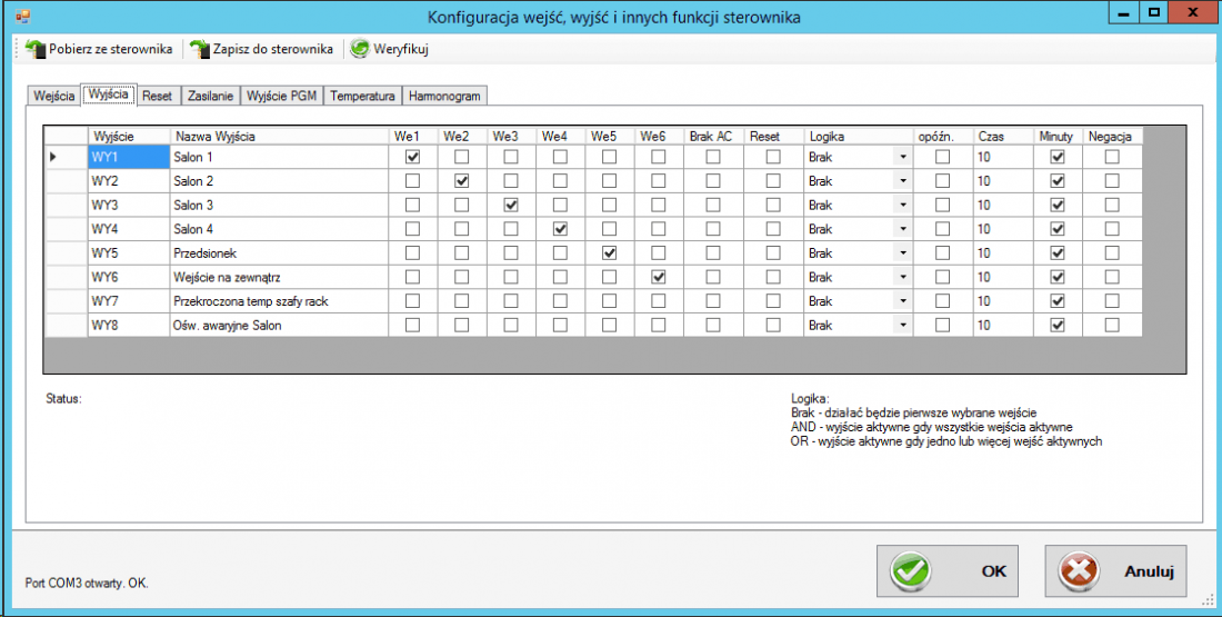 - logika pomiędzy wejściami i wyjściami i temperaturą reakcja na stan,zbocze, wartosć, negacja, opóźnienie wyłączania np. wentylator w łazience i wiele innych.