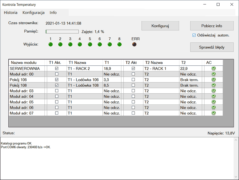 Po skonfigurowaniu i ustawieniu danych system zaczyna pracować. Użytkownik na ekranie głównym może oglądać stan bieżący wartości w sterowniku. Pobranie danych następuje po kliknięciu w przycisk Pobierz info lub zaznaczenie Pobieraj automatycznie (druga opcja odświeża dane automatycznie co ok. 1,5s.). Automatyczne pobieranie może być wstrzymywane podczas np przesyłania konfiguracji czy pobierania historii zdarzeń.