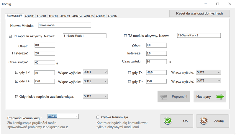 Szybka transmisja - gdy jest zaznaczona ta opcja sterownik odpytuje tylko te moduły w których ustawiono chociaż jeden aktywny element tj termometr T1, T2, czy brak AC - nie jest konieczne jej włączanie w podstawowej wersji sterownika.