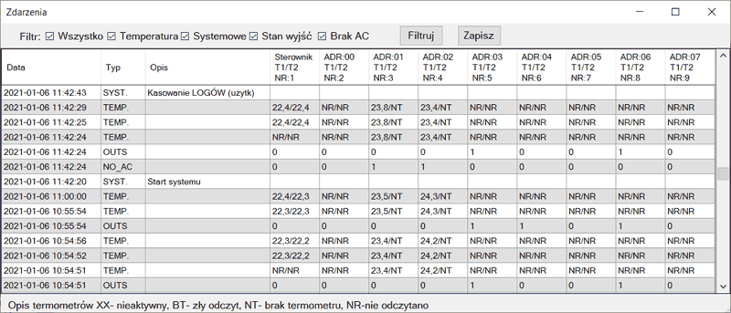 Możemy wybrać wszystkie zdarzenia lub je wyfiltrować wg zadanego typu. Dane można zapisać do pliku csv.