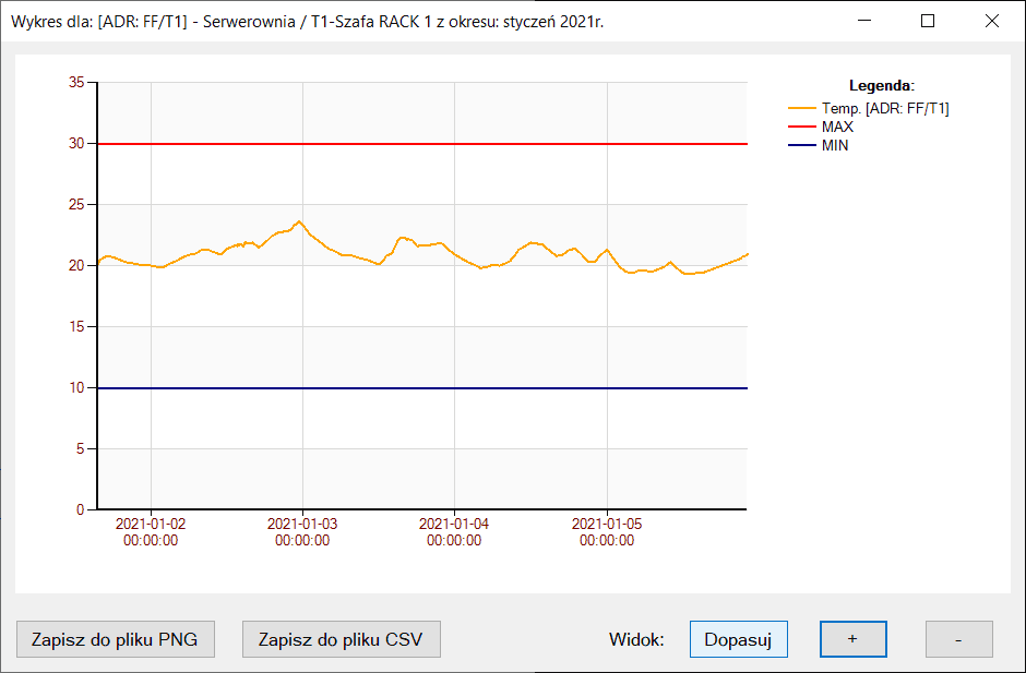 Na listach po lewej wybieramy rok miesiąc oraz moduł i termometr. Po kliknięciu w Załaduj pojawi się wykres z historii temperatury z wybranego miesiąca. Możemy go zapisać do pliku graficznego png bądź do pliku tekstowego csv z danymi do obróbki np w excelu.