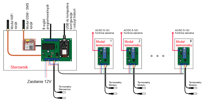 Gdy wystarczający jest pomiar z jednego lub dwóch miejsc będących blisko siebie sterownik może pracować jako urządzenie autonomiczne. Jednak gdy ta odległość jest duża np 50,100, 200, 1000 m lub potrzebujemy pomiaru z większej ilości punktów należy do sterownika dodać moduły termometrów.